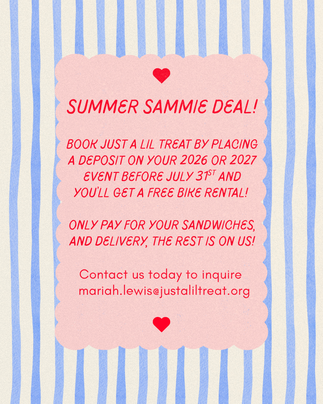 Welcome to Just a lil Treat, where every handcrafted ice cream sammie is made to put a smile on your face! Let your taste buds whirl in delight as you explore our playful array of flavors under the umbrella of our beautiful trike! We can’t wait to help you make a grand entrance at your big event and bring joy with every bite into our lil icy treats!